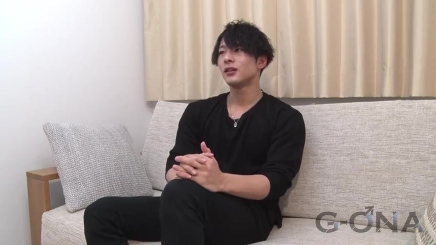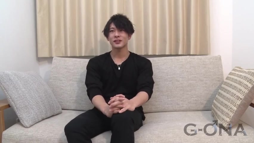 インタビューに笑顔で答える、太股パンパンのスジ筋マッチョイケメンノンケ! スタッフのが、透明オナホで巨根を絞られ精液噴出!